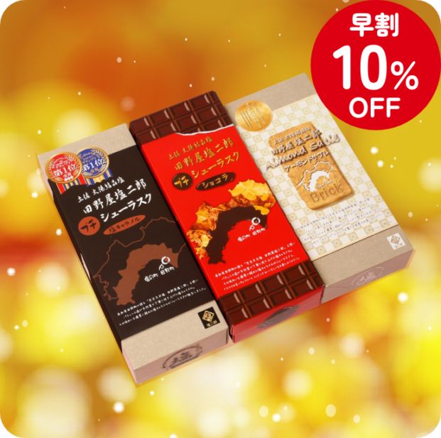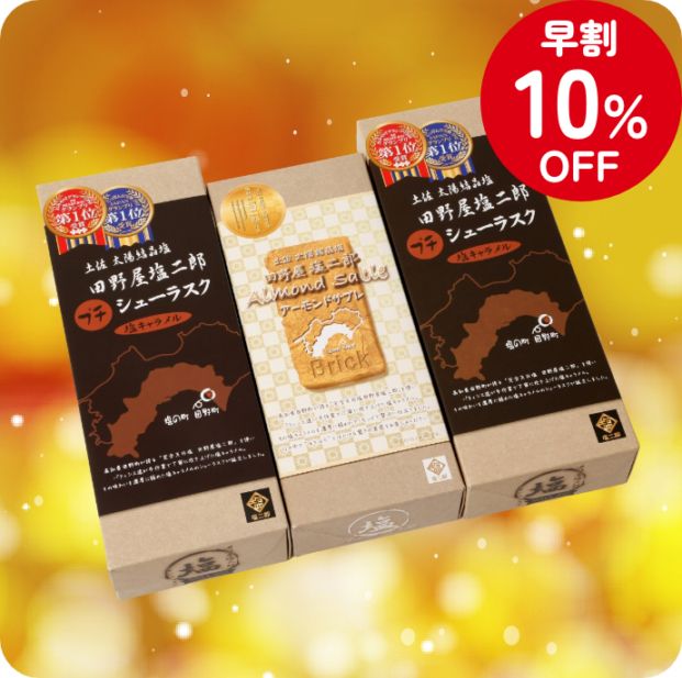 【冬ギフト早割10%OFF】田野屋塩二郎プチシューラスク(10枚入)&田野屋塩二郎プチシューラスク ショコラ(9枚入)&田野屋塩二郎アーモンドサブレ・ブリック(15個入) ※紙袋1枚付