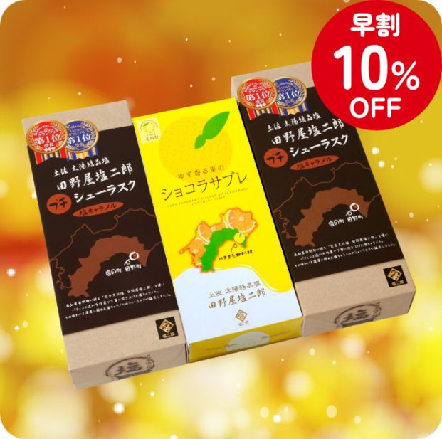 【冬ギフト早割10%OFF】田野屋塩二郎プチシューラスク (10枚入)×2箱 +ゆず香る里のショコラサブレ(10枚入) ※紙袋1枚付