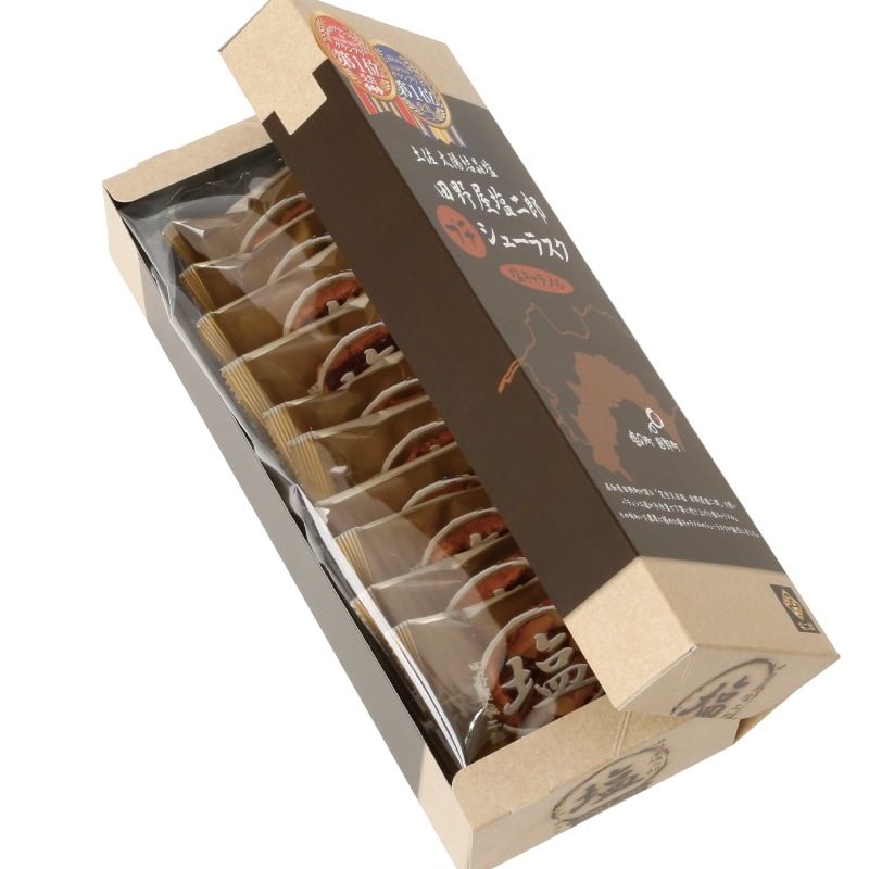 絶品天日塩「田野屋塩二郎」を使い、パティシエたちが手作業で丁寧に炊き上げた塩キャラメルをラスク専用のシュー皮と合わせ、アーモンドスライスをたっぷりのせて、香ばしく焼き上げた「田野屋塩二郎シューラスク」、絶品の塩を使った塩キャラメルを濃厚に絡めた、驚くような口どけのシューラスクが誕生しました。