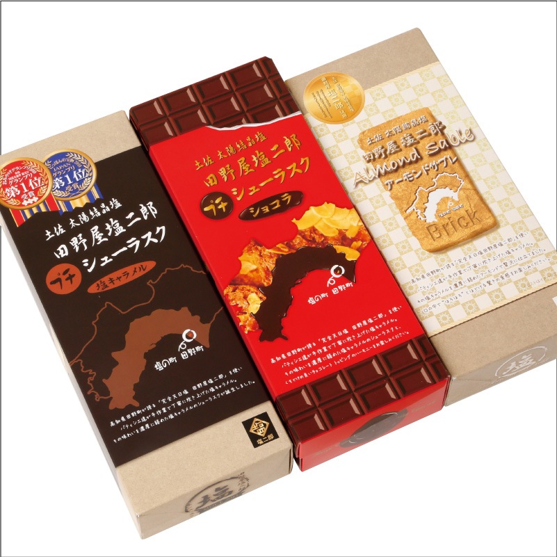 | 内容量 | 田野屋塩二郎プチシューラスク ショコラ(9枚入) 田野屋塩二郎プチシューラスク(10枚入) 田野屋塩二郎アーモンドサブレ・ブリック(15個入) |